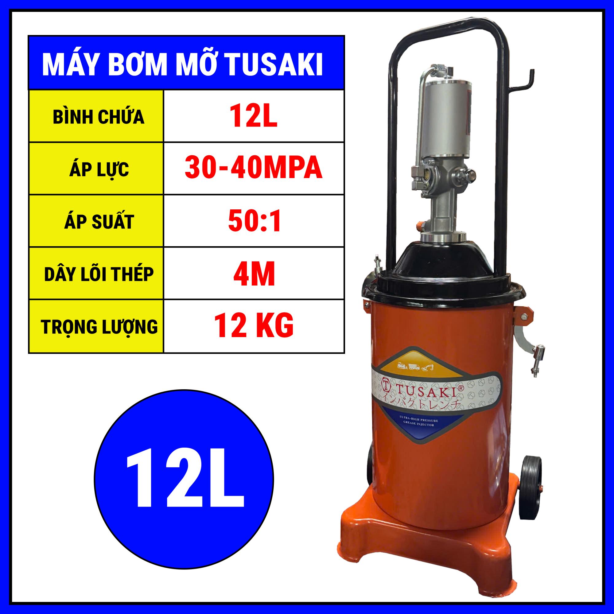Máy bơm mỡ 12 lít TUSAKI – hàng Nhật chính hãng được thiết kế chuyên dụng cho xưởng cơ khí, gara ô tô và bảo dưỡng máy móc công nghiệp.