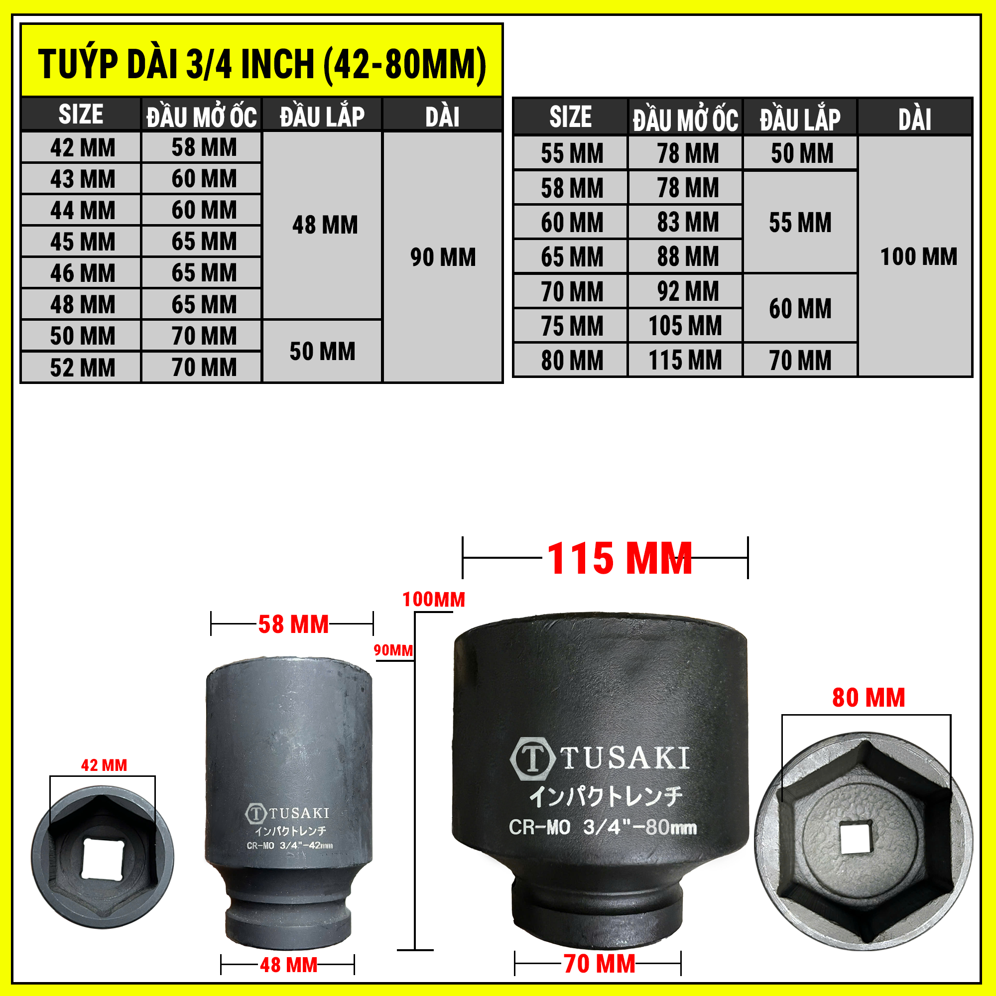 Đầu tuýp dài 3/4 inch Tusaki là lựa chọn đáng tin cậy cho các thợ sửa chữa và gara cơ khí chuyên nghiệp. Chất liệu thép hợp kim cao cấp, bề mặt mạ chrome chống gỉ, giúp sản phẩm luôn sáng bóng và bền bỉ theo thời gian. Thiết kế đầu lục giác giúp siết chặt bulong hiệu quả, thao tác dễ dàng ngay cả trong môi trường công nghiệp nặng.
